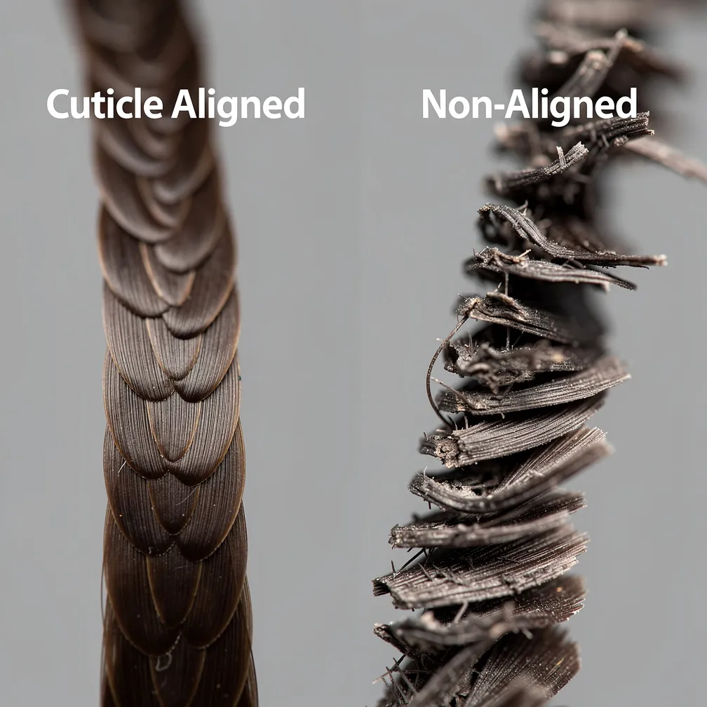 Cuticle aligned hair has intact cuticles all pointing in the same direction, giving it natural longevity, minimal tangling, and the ability to be colored and heat styled repeatedly. Non-cuticle aligned hair has strands mixed in random directions, causing tangling. It is typically processed with an acid bath to strip the cuticle and then coated with silicone to simulate smoothness — a coating that washes off after a few weeks of wear, leaving rough, unusable hair.