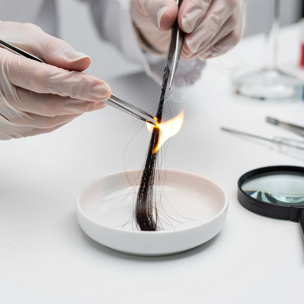 How to perform: Take 5-10 strands from the sample. Hold one end with tweezers or fingers and bring the other end close to a lighter flame. Observe the burn behavior and smell.